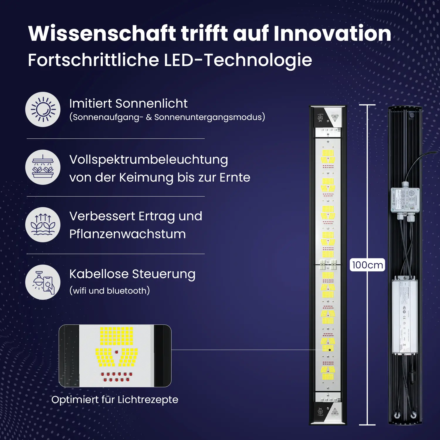 Wissenschaftlich fundierte Lichtrezepte: Das Herzstück. Du bekommst drei optimierte Spektren – Grow, Bloom und Harvest – für jede Phase deines Grows.