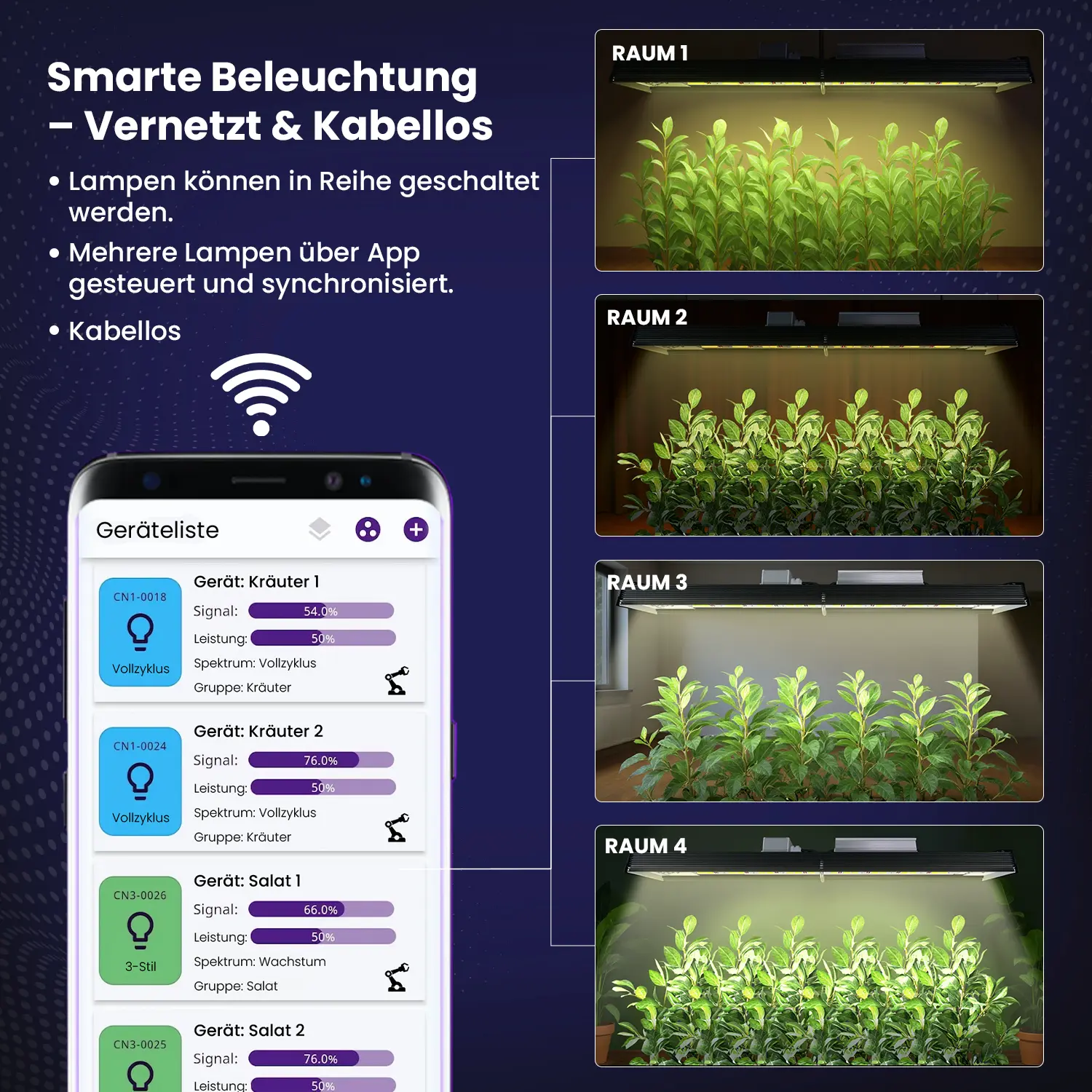 Herkömmliche Lampen bieten ein statisches Spektrum. Die SMART GROW SERIES bietet dir dynamische Lichtrezepte – präzise spektrale Formeln, die für jede Phase der Pflanzenentwicklung optimiert sind. Du kannst so endlich die perfekten Lichtbedingungen für jede Wachstumsstufe schaffen.